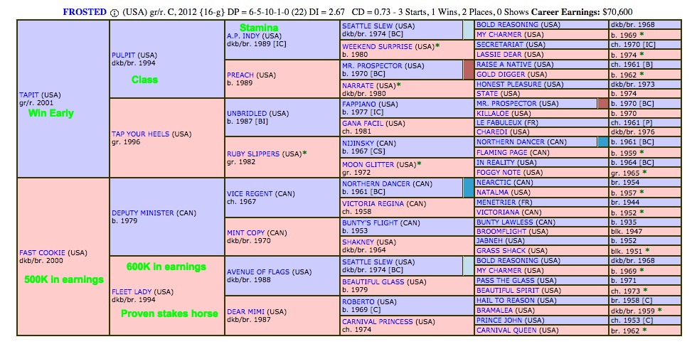 The 2nd mare provides more proven racing accolades with Fleet Lady winning 10 of 23 starts and over 600K in earnings. This combination of proven sire, and 2 generations of racing on the female side should serve Frosted well as he moves up the class ladder for Godolphin Stable. Several stamina influences are in the first 3 generations including: A.P. Indy, Unbridled, Pulpit, Deputy Minister. Roberto and Seattle Slew are both in the 4th generation.