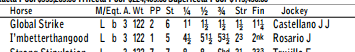 Race 5: Global Strike is passed on the turn by a horse who has been coming from behind who make a 3 wide early move into this race to get involved in the pace. Global Strike who was passed last race. Gallantly comes back on the rail and wins.