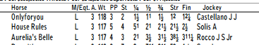 With 2 wins from the off the pace in her career sprinting and possibly pointing for the Kentucky Oaks, maybe a trainer and jockey would rate her a little bit and teach her to stretch out the speed. WRONG! Castellano sends from the gate, and scrubs on the turn, repelling every challenge from House Rules, who although a nice horse, is being scrubbed by Solis going into the turn and still finishes 2nd clearly overly the field. Above par fractions, but final time not out of the ordinary.