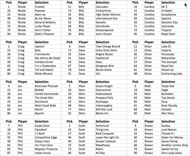 Racing fans from across the country gathered in Google Chat on Sunday for the 2nd Annual Triple Crown Fantasy Draft. A horse racing league restricted to 3-year-old races for fillies and colts from the Holy Bull through the Belmont Stakes. This year the league consisted of 12 people and 8 rounds of a snake draft. Season long points are accumulated by designated races that put a premium on the Triple Crown preps.